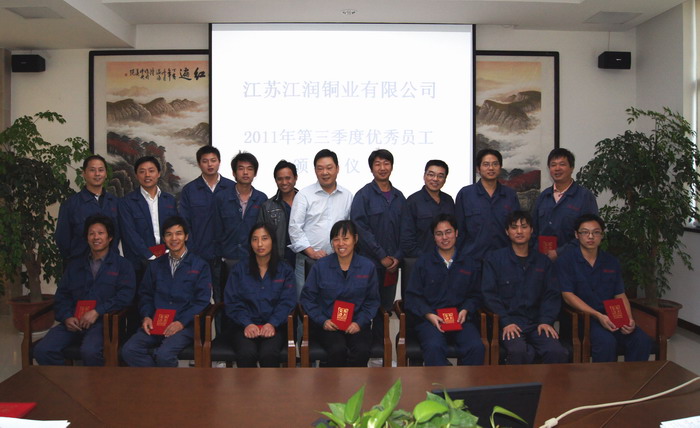 10月16日下午,在江潤(rùn)銅業(yè)辦公樓一樓大會(huì)議室,總經(jīng)理駱偉棟主持召開了2011年第三季度優(yōu)秀員工表彰大會(huì)。三季度共評(píng)選出17名優(yōu)秀員工,其中15名來(lái)自生產(chǎn)一線。駱總表示,上下一心,共同努力,實(shí)現(xiàn)企業(yè)與個(gè)人的共同發(fā)展。